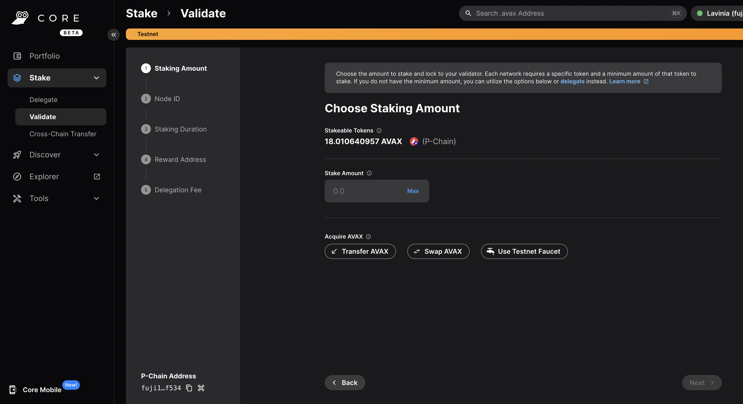 - Stake Amount: The amount of AVAX to lock for staking. On Mainnet, the minimum required amount is 2,000 AVAX. On Testnet the minimum required amount is 1 AVAAX.